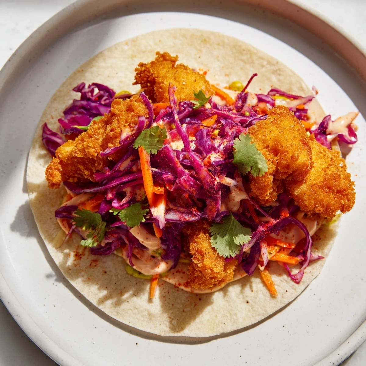 - Déposer quelques morceaux de poisson croustillant sur chaque tortilla. Garnir du chou mariné et arroser de crème. Servir immédiatement avec des quartiers de citron vert.