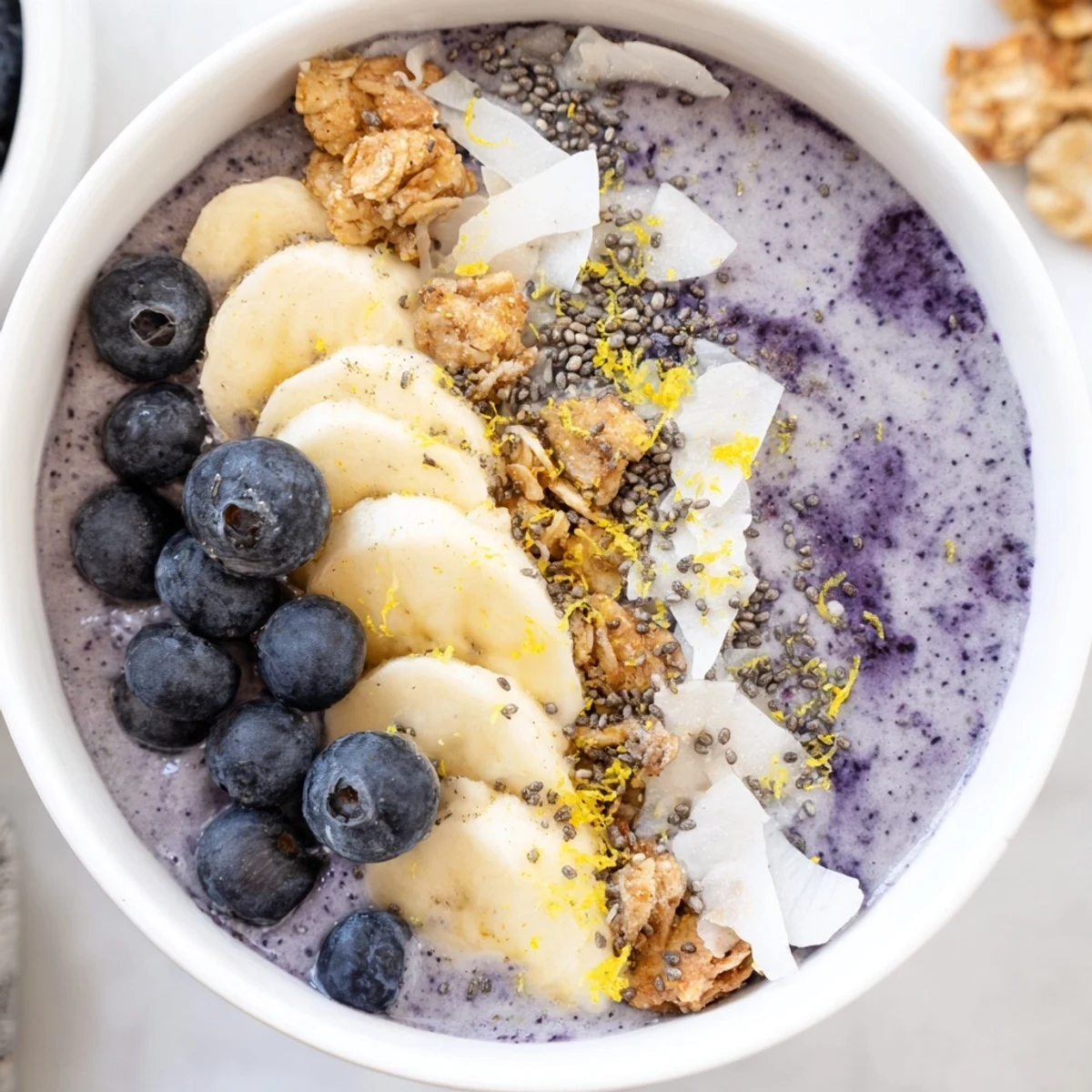 - Répartissez le smoothie violet dans deux bols en lissant légèrement la surface avec le dos d'une cuillère. Disposez artistiquement les myrtilles fraîches, les rondelles de banane, le granola, les graines de chia, la noix de coco râpée et un soupçon de zeste supplémentaire.